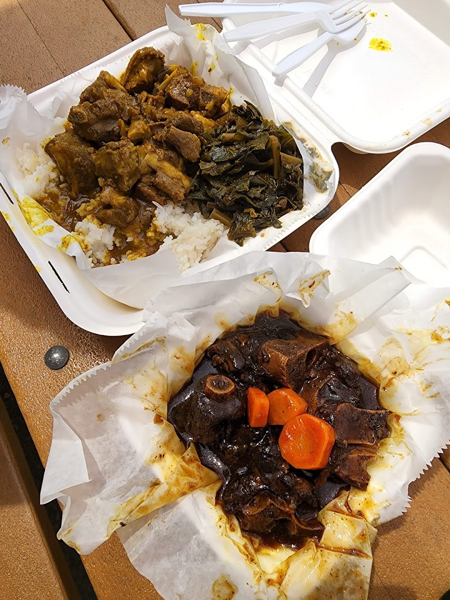 pricey but good. would recommend trying. we got oxtail and chicken platters. the sauce and rice combo was very tasty. collard greens were nicely seasoned. this is inside the farmers market.